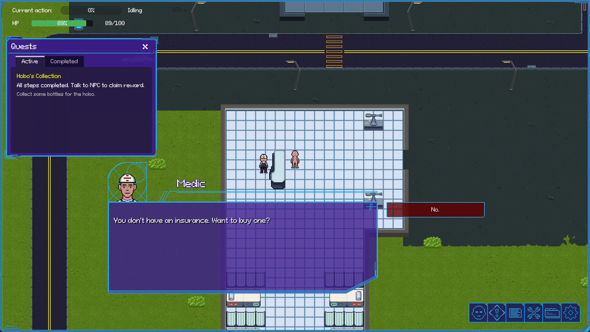 So the only option I've found to probably progress after solar farm is earn 1k credits and talk to the health insurance guy. The best way I've found to earn credits is chopping trees? Feels rather slow. I may end up doing it because I am intrigued by the game, but I wish the pacing was a bit faster or there were better ways to earn money (such as learning more crafting recipes when levelling up). Also I want my guy to wear clothes eventually.